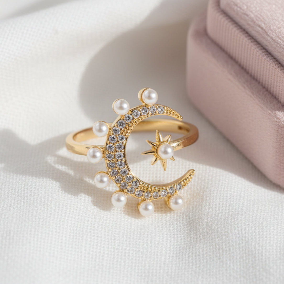 Añade un toque de magia celestial a tu colección de joyas con el Anillo de luna y estrella decorado con perlas. Inspirado en la belleza del cielo nocturno, este encantador anillo presenta un elegante diseño de media luna adornado con brillantes circonitas cúbicas, bellamente complementado con delicadas perlas artificiales que brillan como pequeñas estrellas.