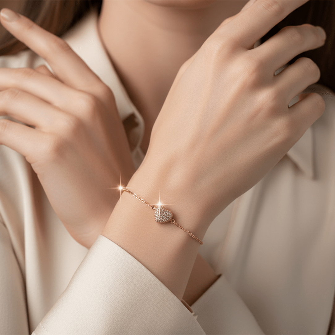 The graceful chain sits lightly on the wrist, offering everyday comfort while adding a subtle touch of brilliance. Whether worn alone or layered with other favorites, this bracelet brings a soft glow to every look and a heartfelt message to every moment.