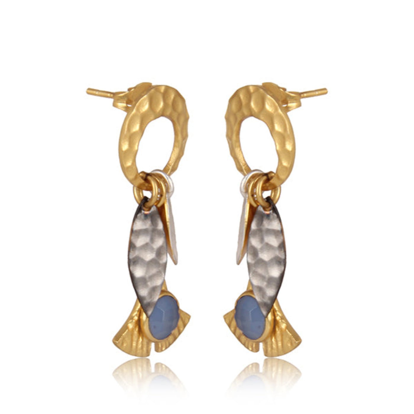Crafted in premium brass with a textured dual-tone finish, these earrings feature a captivating Glass Blue Chalcedony stone that mirrors the calm allure of the night sky. Every curve and shimmer reflects sophistication and love for timeless beauty.